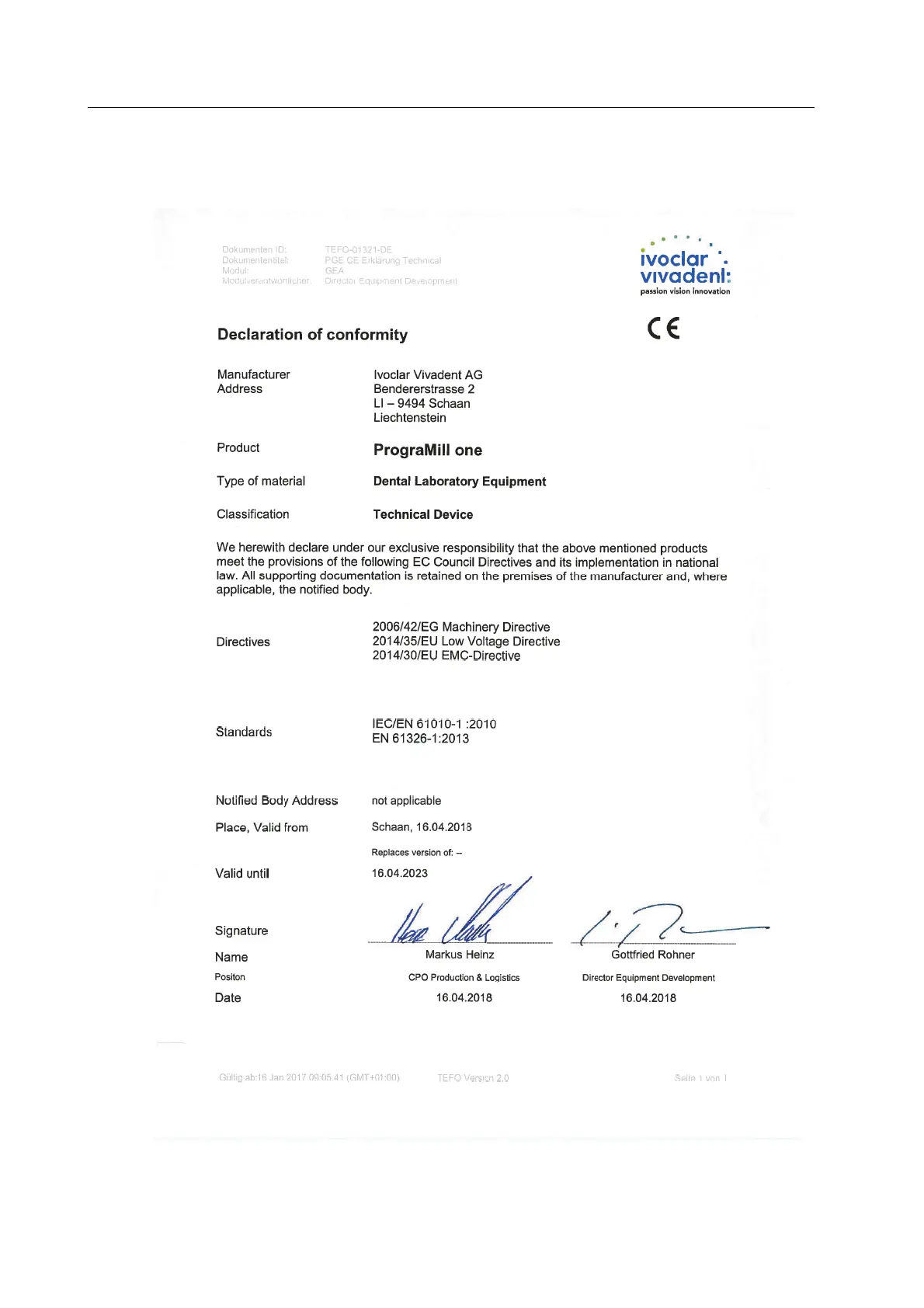 Ivoclar digital PrograMill One - CE Marking; Declaration of Conformity