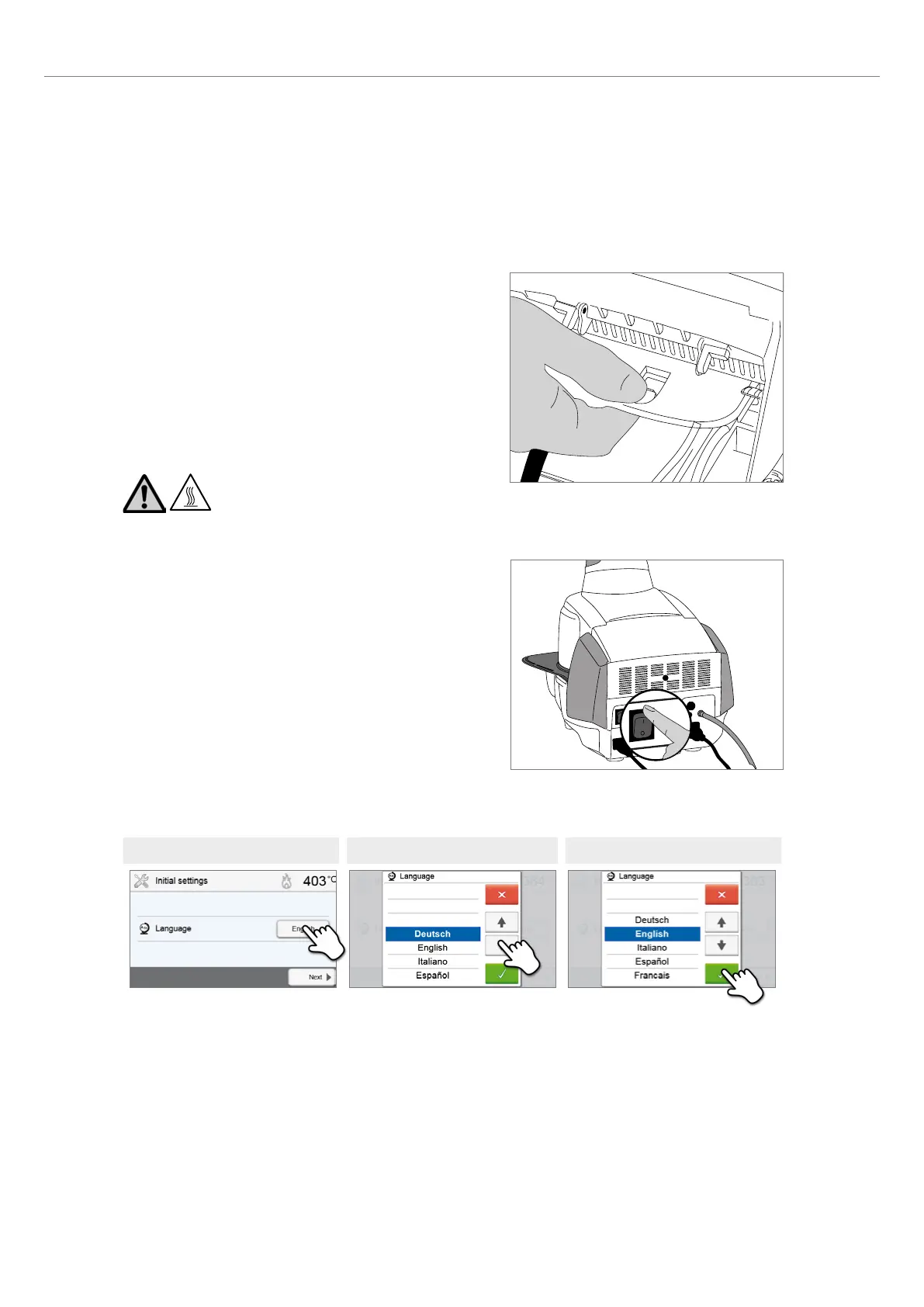 The first setting is the language selections. The touch buttons (display keys) can be operated by tapping the display.