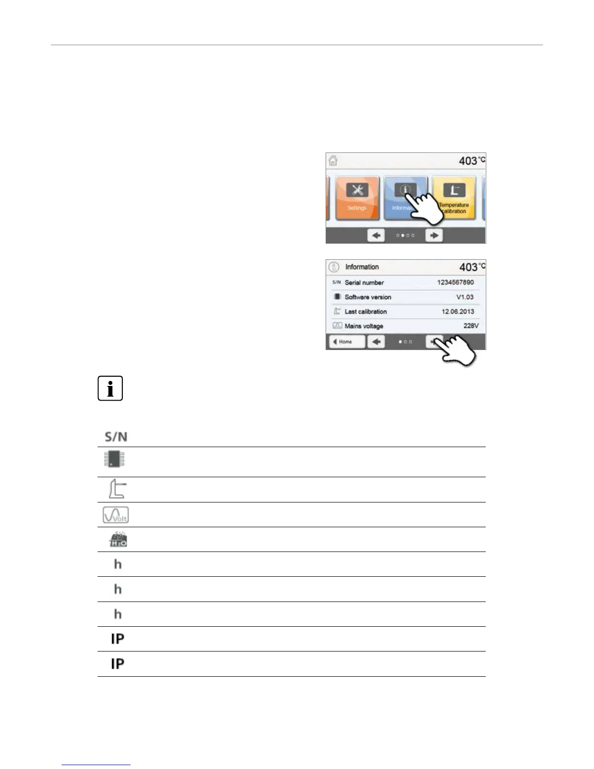 To reach the screen for the furnace information, scroll to page 2 in the home screen and press the [Information] touch