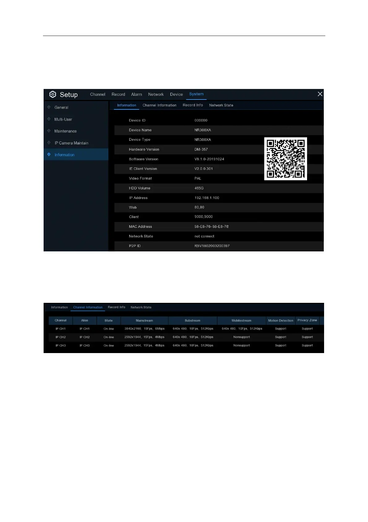 If your NVR supports P2P function, you will find the P2P ID & P2P QR code in the information