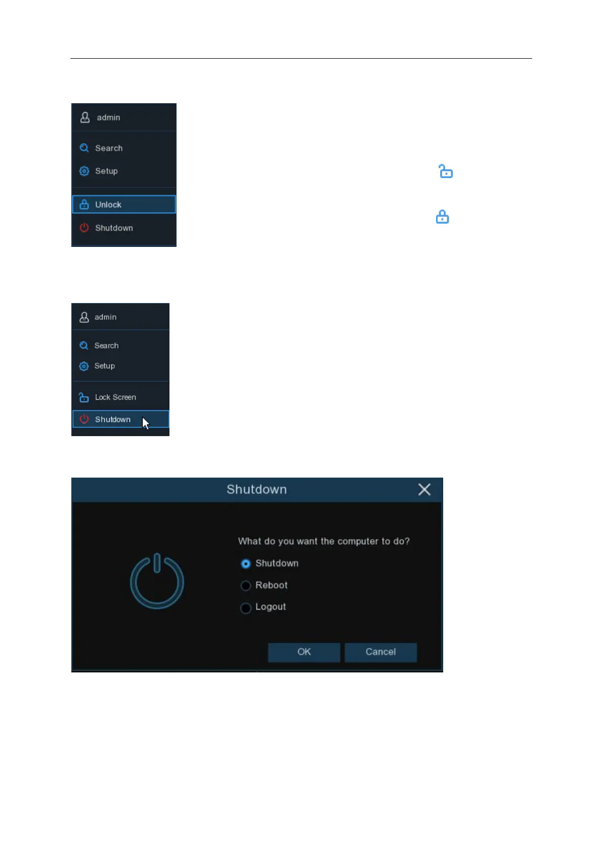 Click the Shutdown button from the Start Menu, select from Shutdown, Reboot or Logout. Click