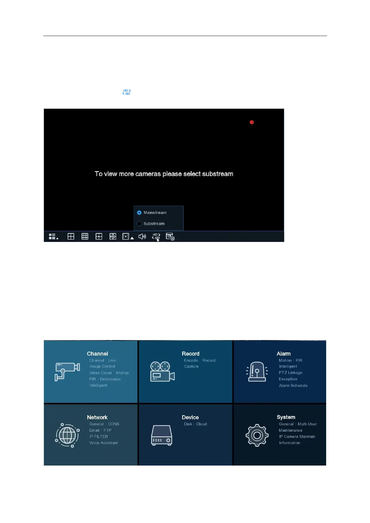 To configure channel, record, alarm, network, device and system settings click on the Start Menu