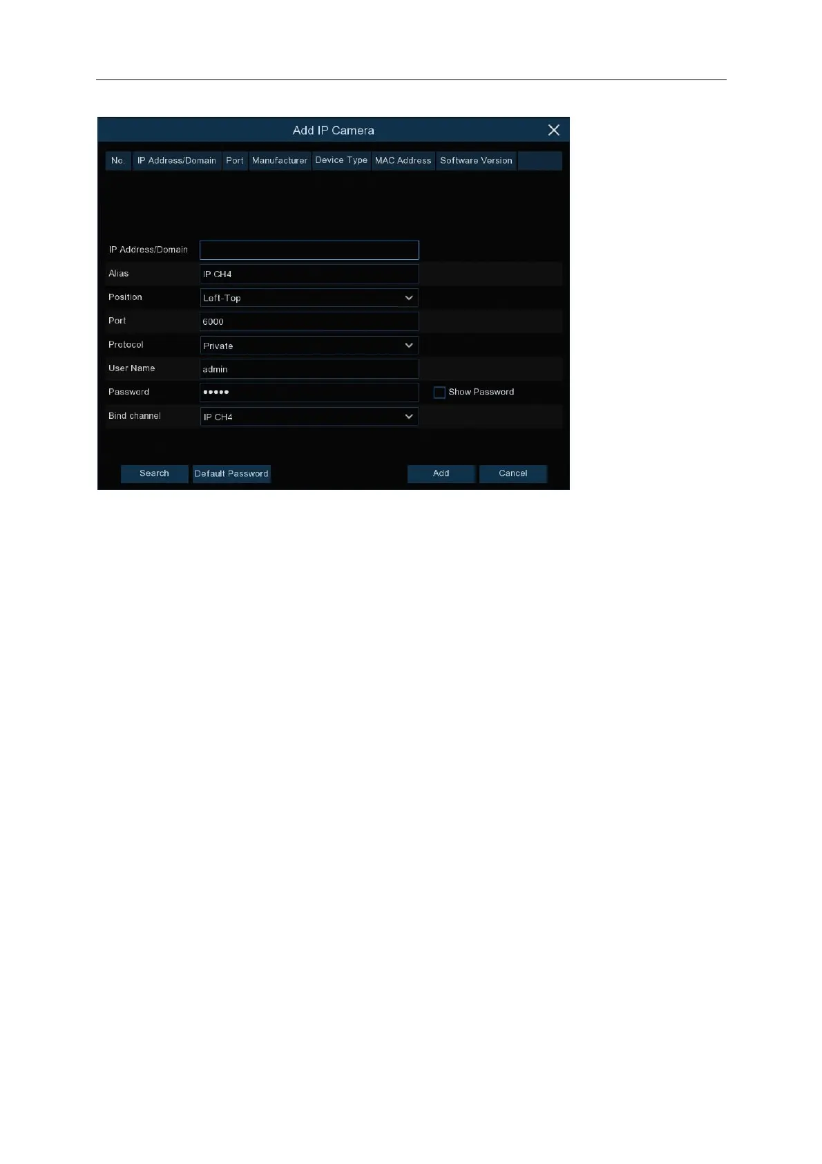 Click Search to search IP cameras from the local network, click Add to add individual IP cameras,