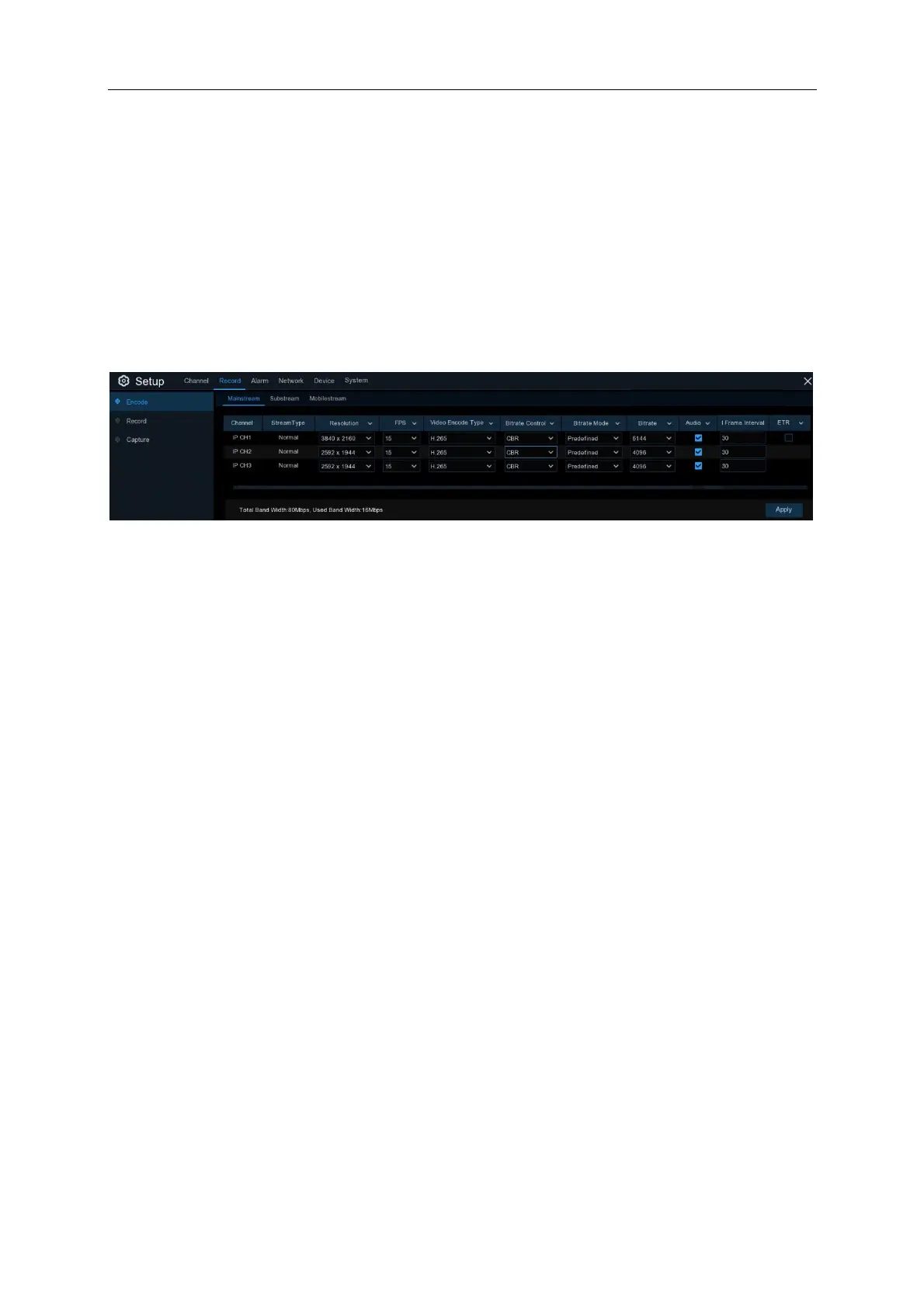 Bitrate: This parameter corresponds to the speed of data transfer that the NVR will use to record