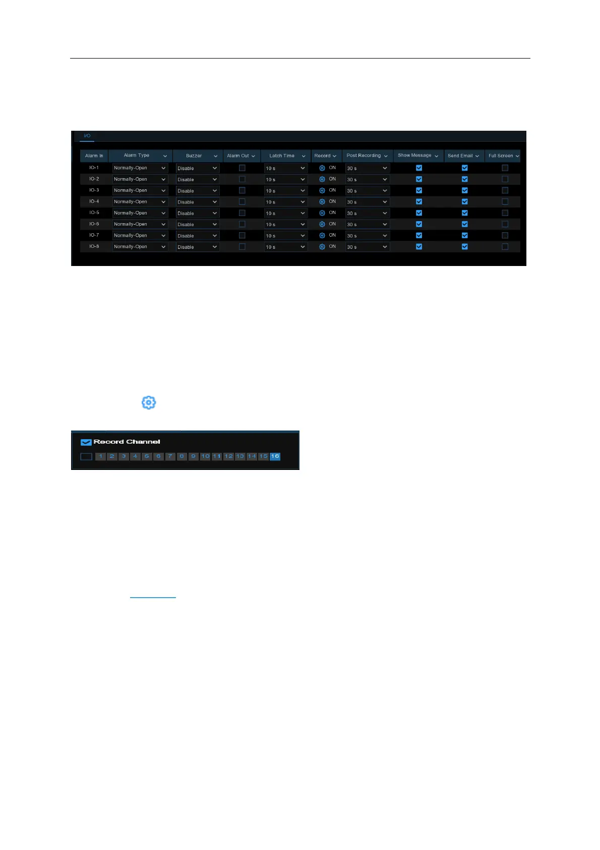 Buzzer: The NVR can use its internal buzzer to emit an alarm tone. You can set the buzzer