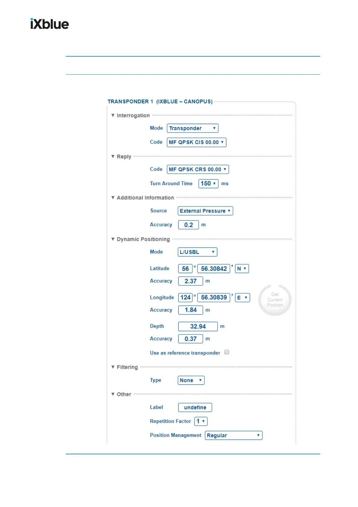 The configuration window opens. The image shown corresponds to a RTA transponder.