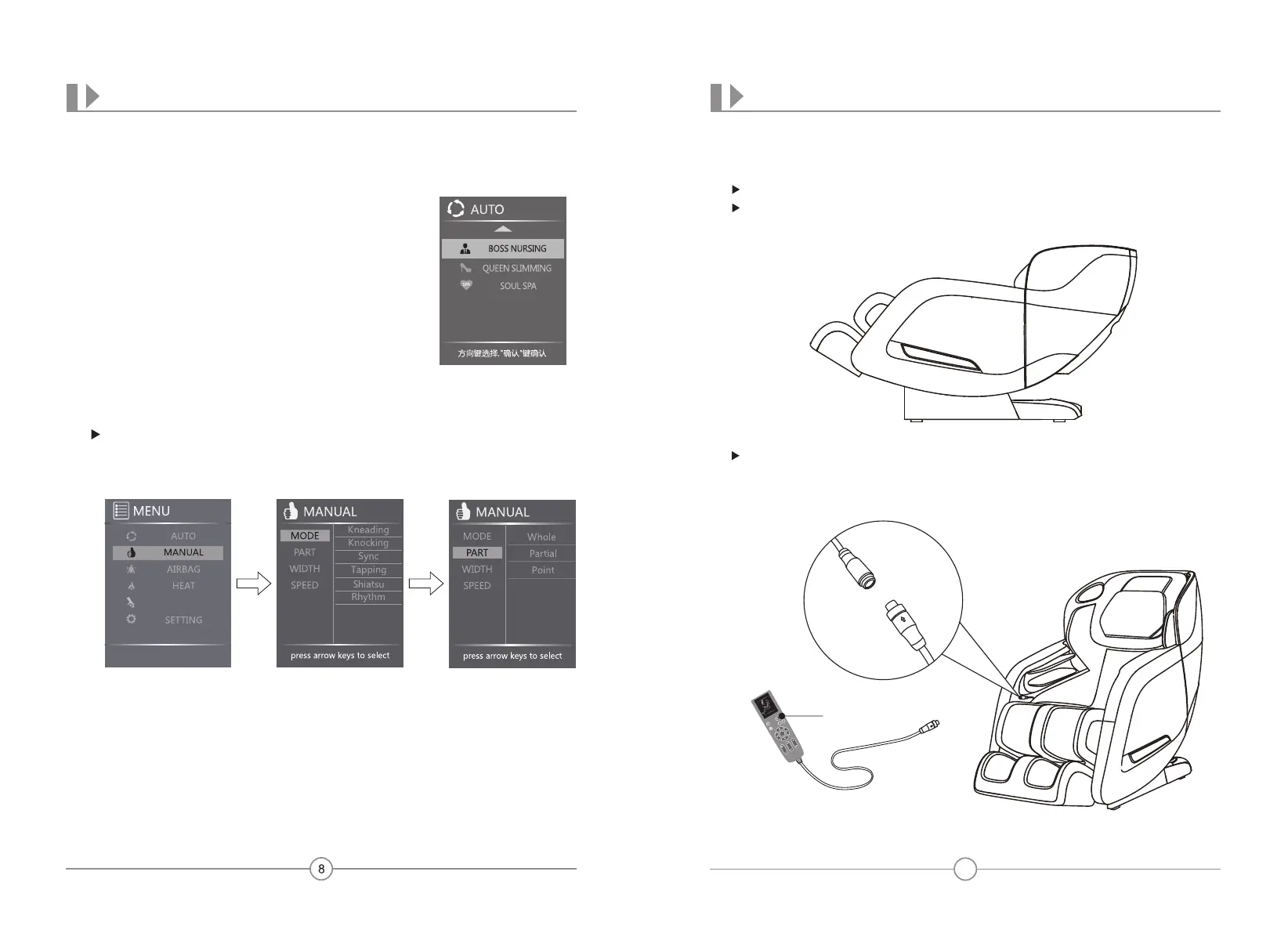 Back Mechanism Massage Part:Press PART from MANUAL display,press Right