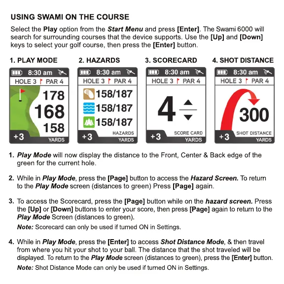Izzo Golf SWAMI 6000 - Using the Swami 6000 on the Course; Play Mode Navigation; Hazards Screen; Scorecard Functionality