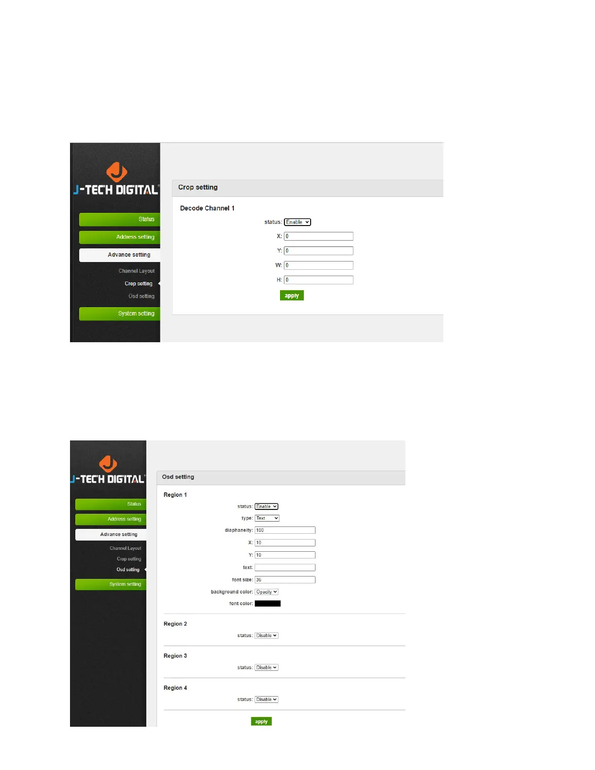 To adjust the image, go to “Advance setting → Crop setting → Set 'X Y’ fields for video coordinates, and
