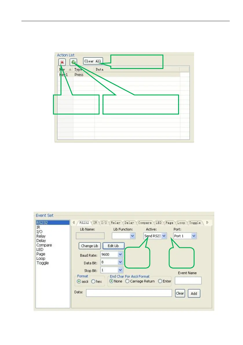 Event setting includes RS232, IR, I/O, Relay, Delay, Compare, LED, Page, Loop and