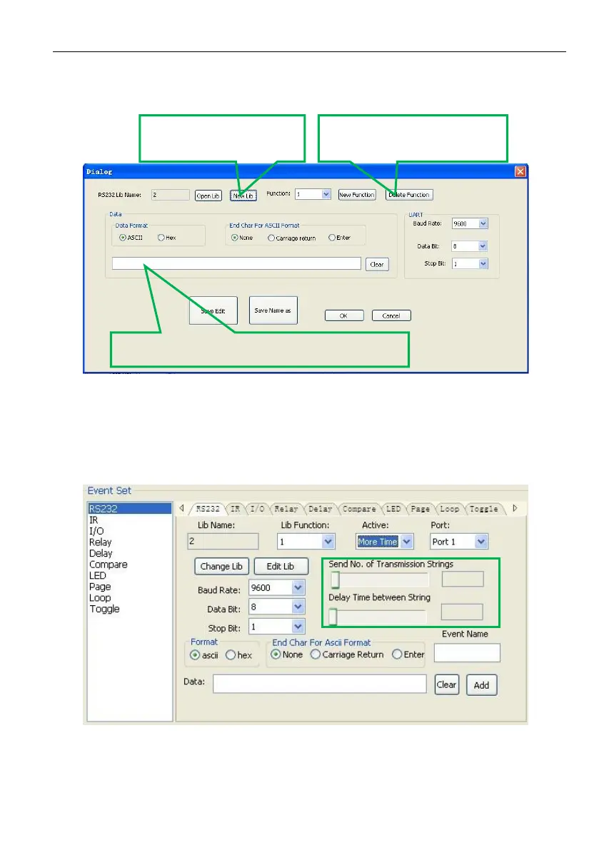 1) The data of RS232 can be directly entered or selected from library. Click “Change