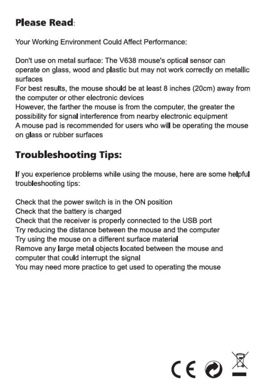 Don't use on metal surface: The V638 mouse's optical sensor can