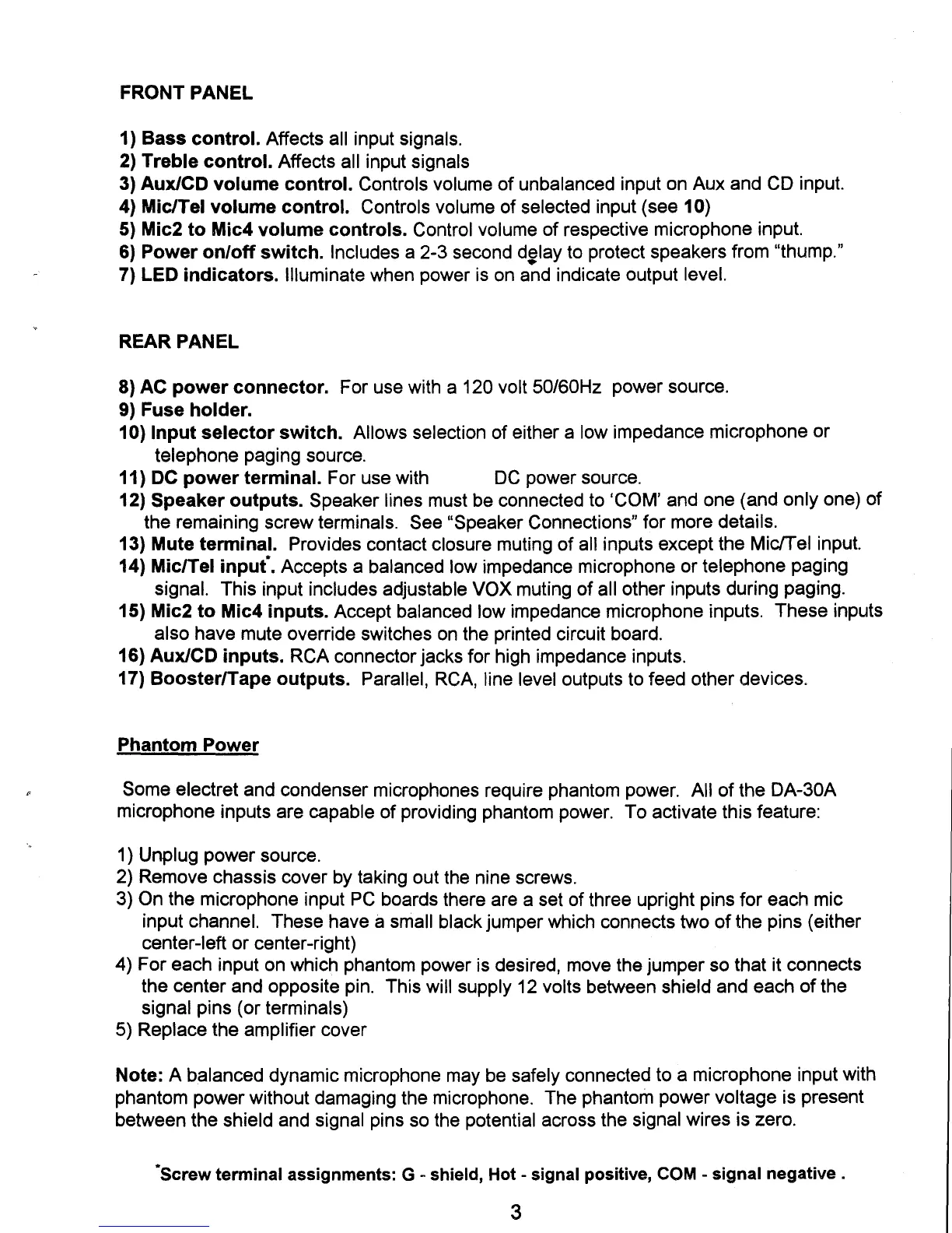 J.W. Davis DA-60A - Detailed Descriptions and Phantom Power; Detailed Panel Functions; Phantom Power Activation