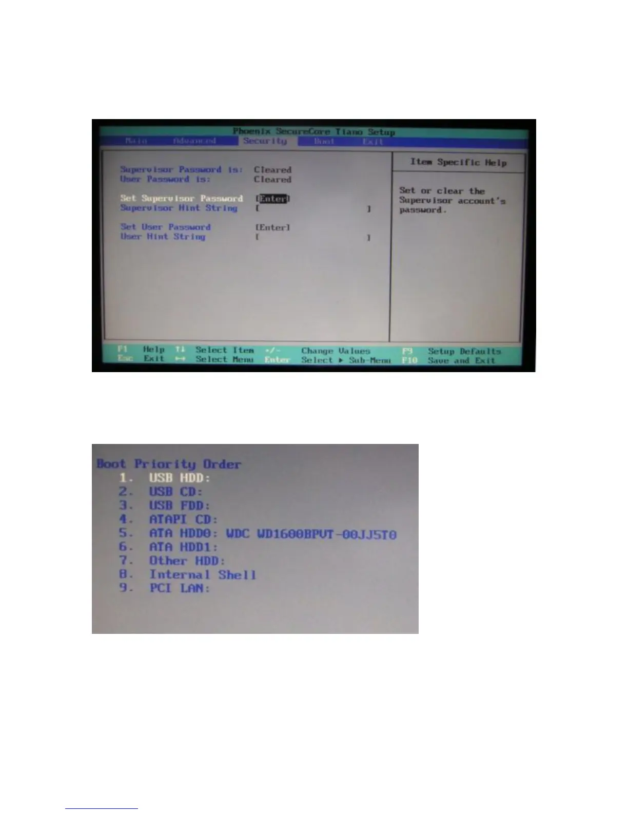 The Security Screen is used to set BIOS accessed passwords.