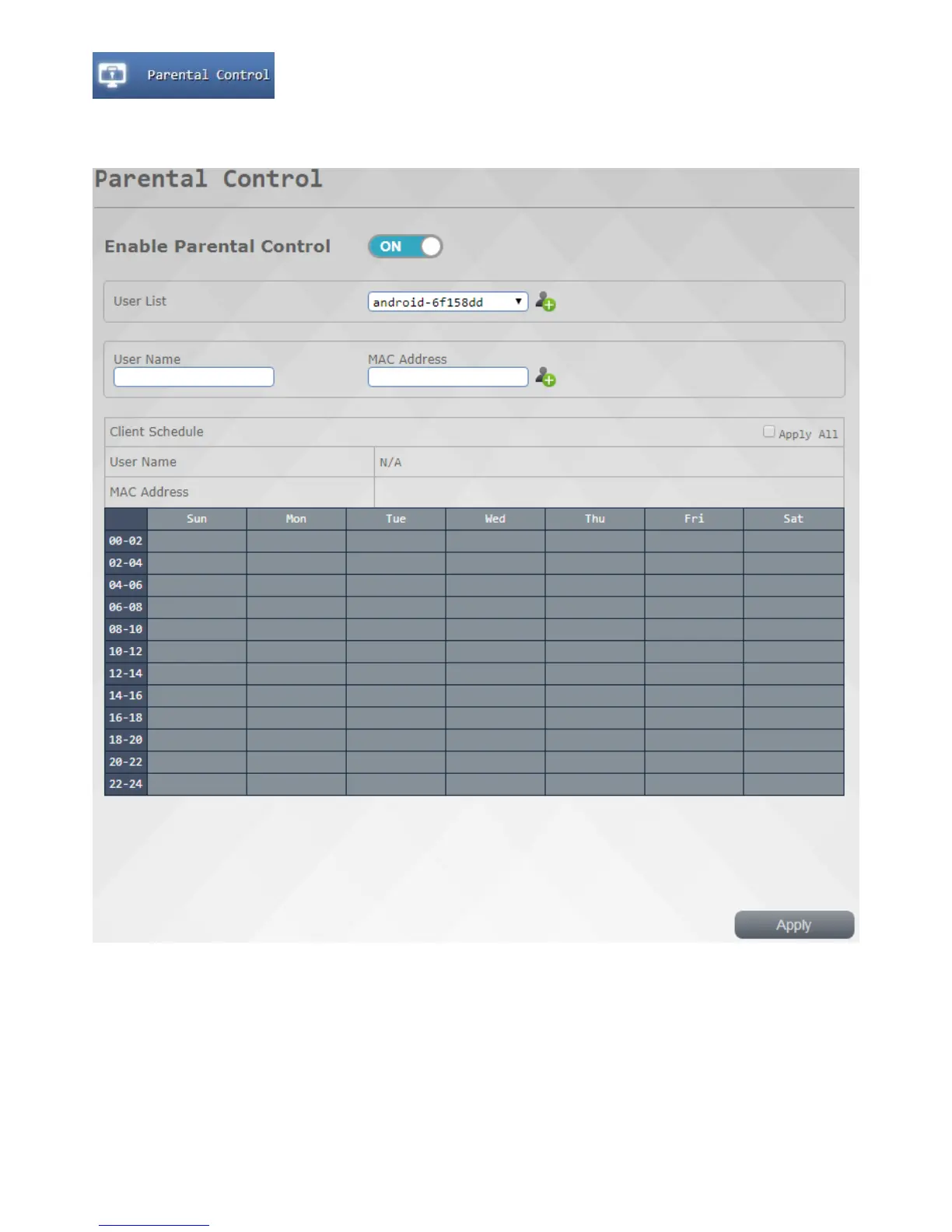 Allow you to set parental control network usage time limit of the user, you can use for each by individual use of time