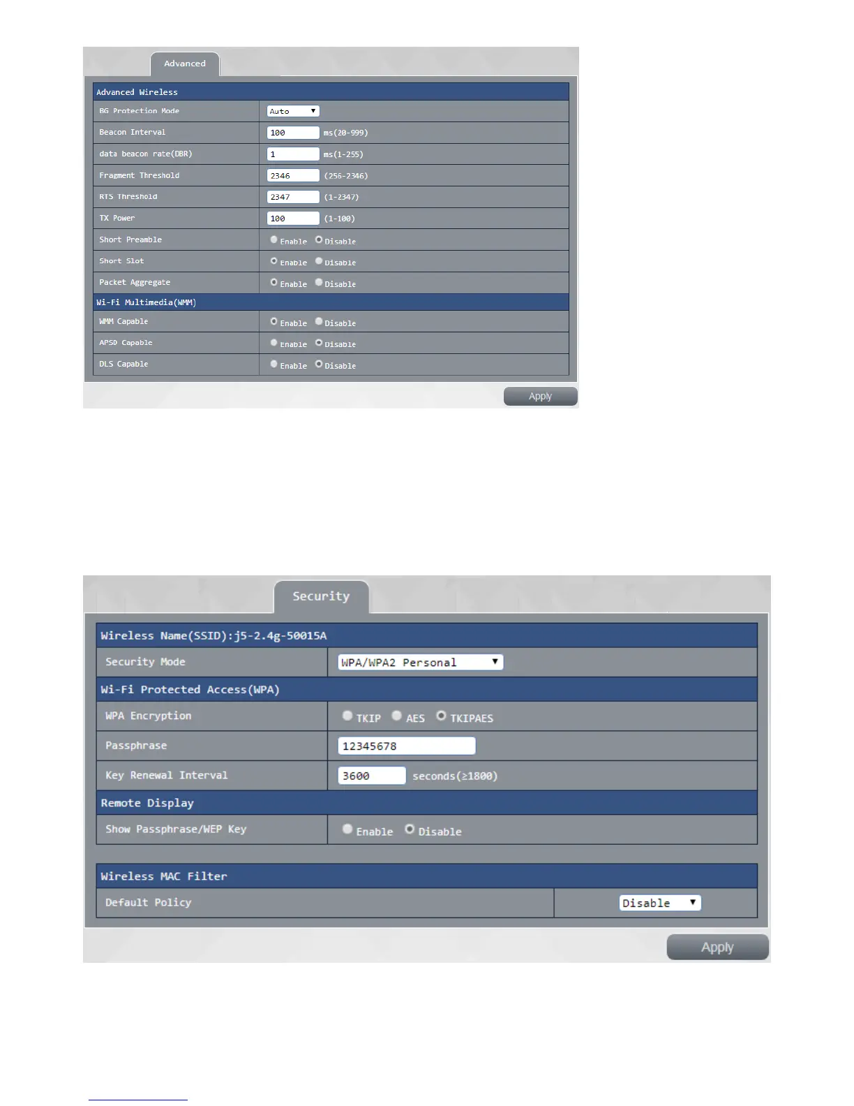 WPA2 personal security mode, encryption option to use AES encryption or TKIPAES encryption,