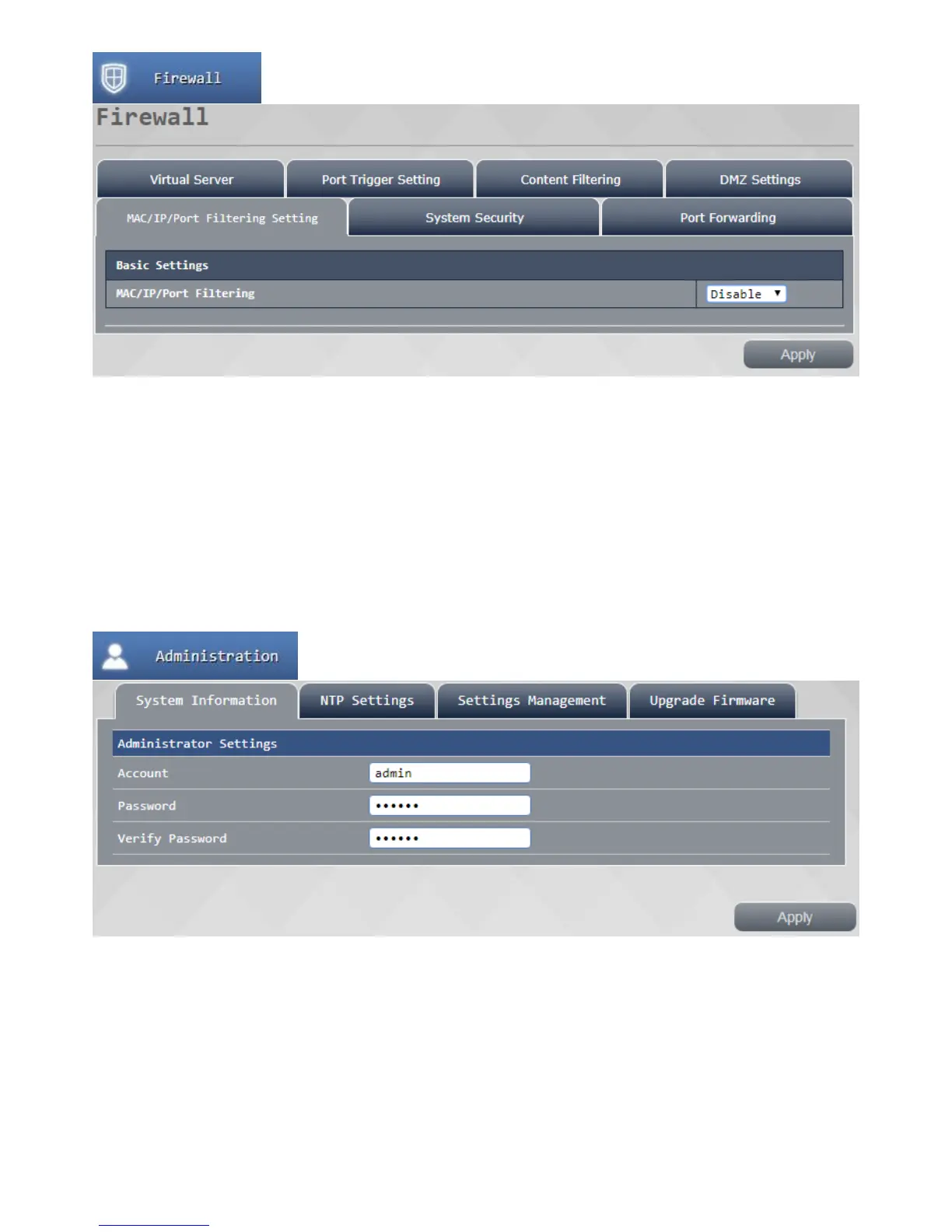 This page can be set / change your router administrator account and password, set the time, use a router
