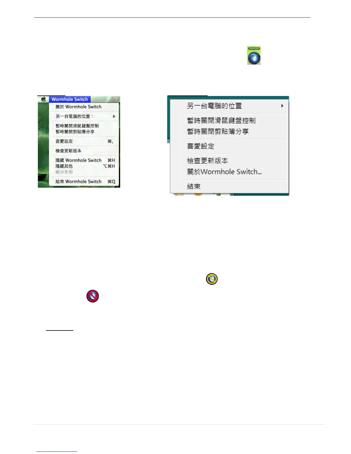 暫時關閉 鍵盤與滑鼠分享功能,您可以看到暫時關閉圖示( );暫時關閉剪貼簿功能,您可以看到