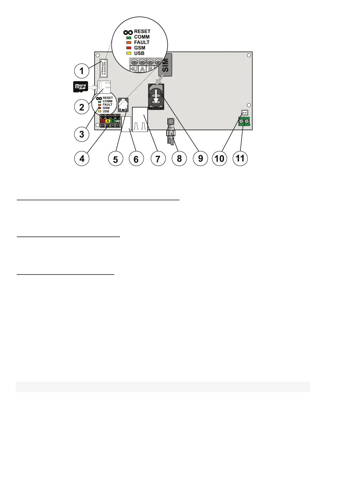 only), 8 - GSM antenna connector; 9 - SIM card holder; 10 - Panel Lid Tamper pins; 11 - Power supply input from the transformer