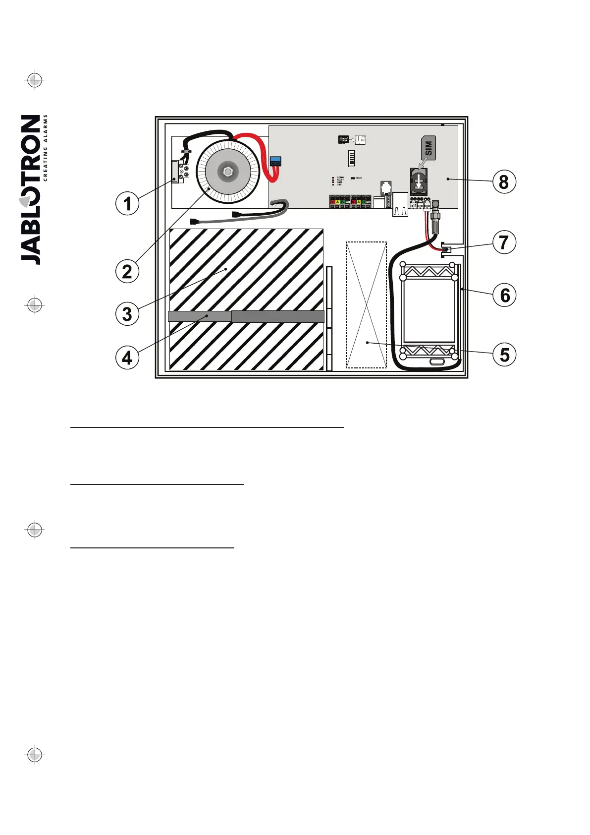5 - cabling space; 6 - GSM antenna; 7 - Panel lid tamper pins. Including spare tamper pins; 8 - Control panel PCB