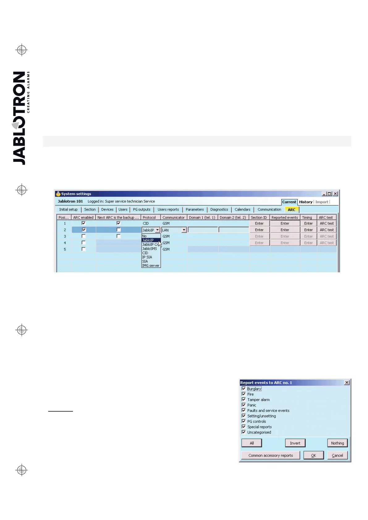 Technician authorization level. The option is also unavailable if Communication Jablotron is selected, which