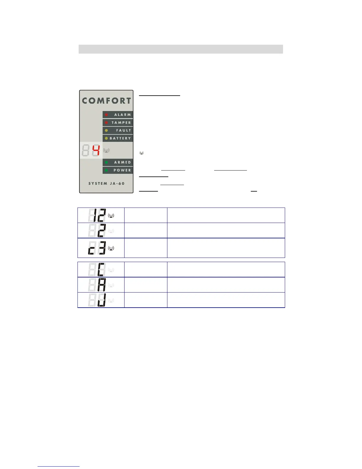 Armed: continues = armed, slow blinking = exit delay,