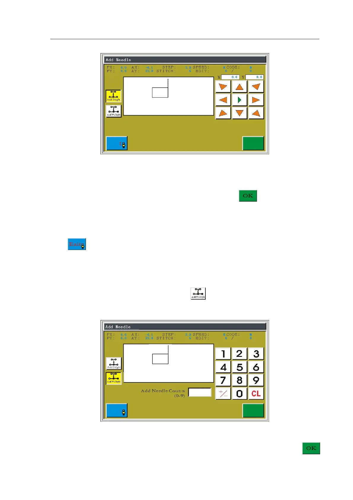 Press the direction keys to move to the position where it needs to append stitch, the X, Y