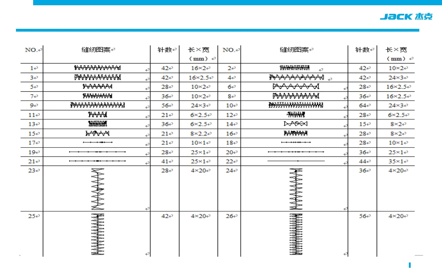 Jack JK-1900BSK - Sewing Pattern Catalog; Bar Tacking Stitch Patterns