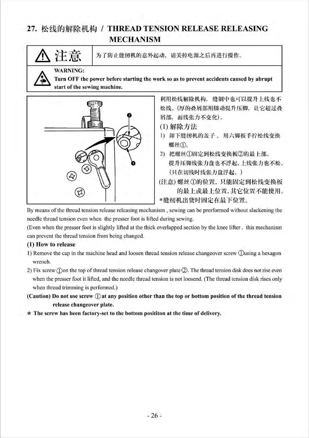 I) Remove the cap in the machine head and loosen thread tension release changeover screw (Dusing a