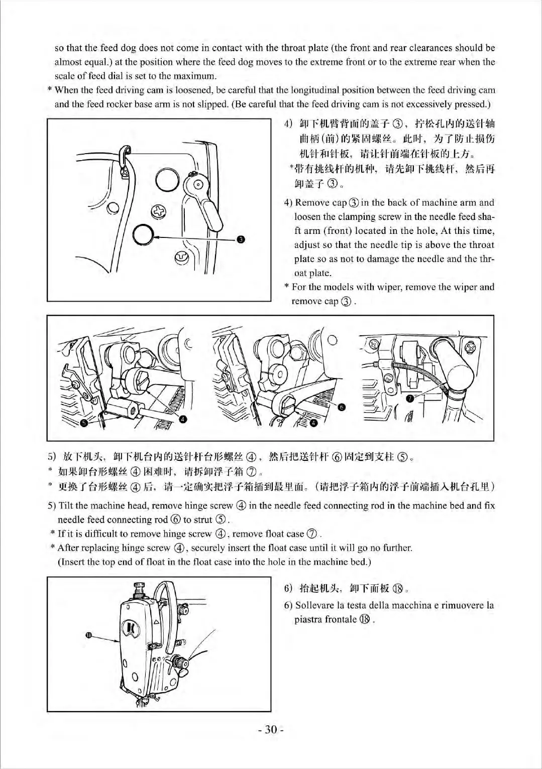 5) Tilt the machine head, remove hinge screw @ in the needle feed connecting rod in the machine bed and fix