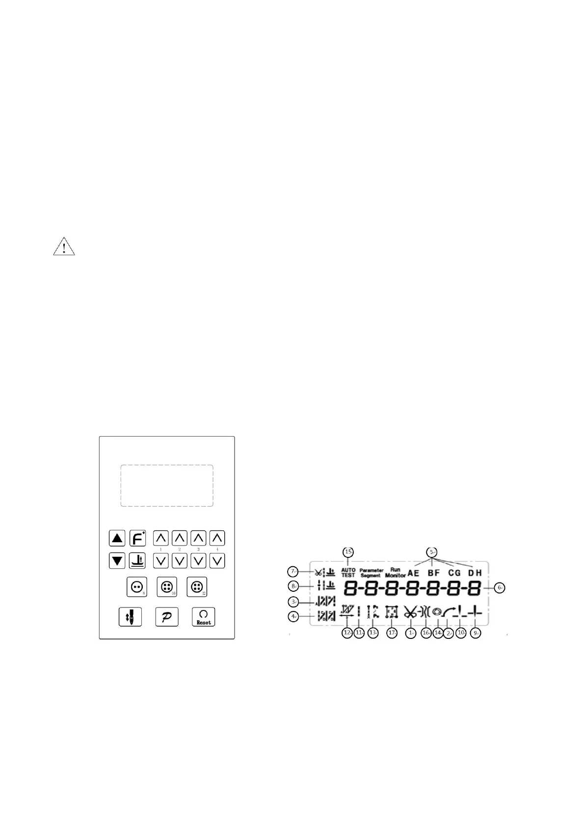 根据系统工作状态,操作面板的液晶屏模块将显示当前的缝纫模式、各种参数、前/后