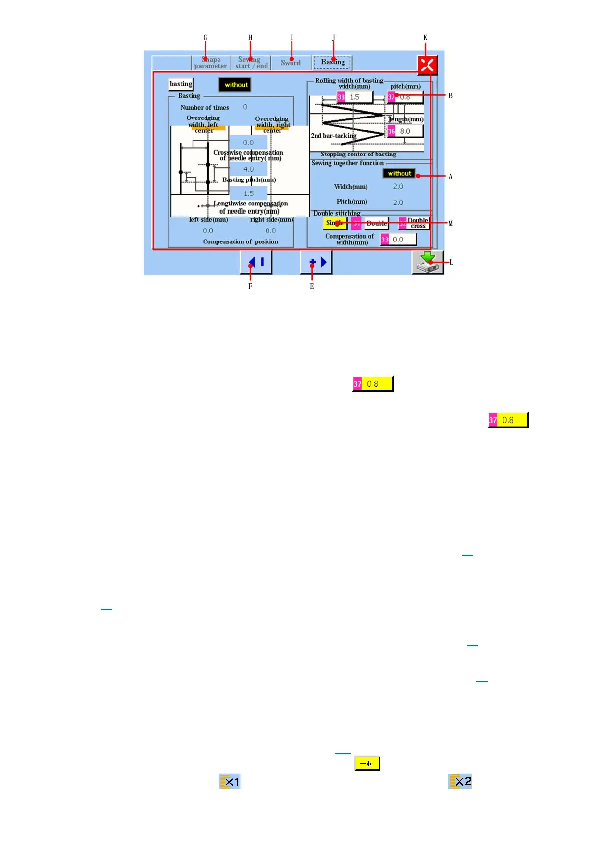 M 重缝参数显示区域。双重缝制的有无设定按键。当为黄色的方块时,如 ,表示当前重缝参数设置的状态为一重