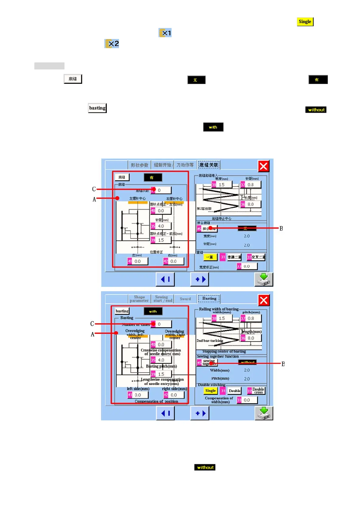 Double stitching display area. Single or double stitching button. When the button turns into color, such as , it