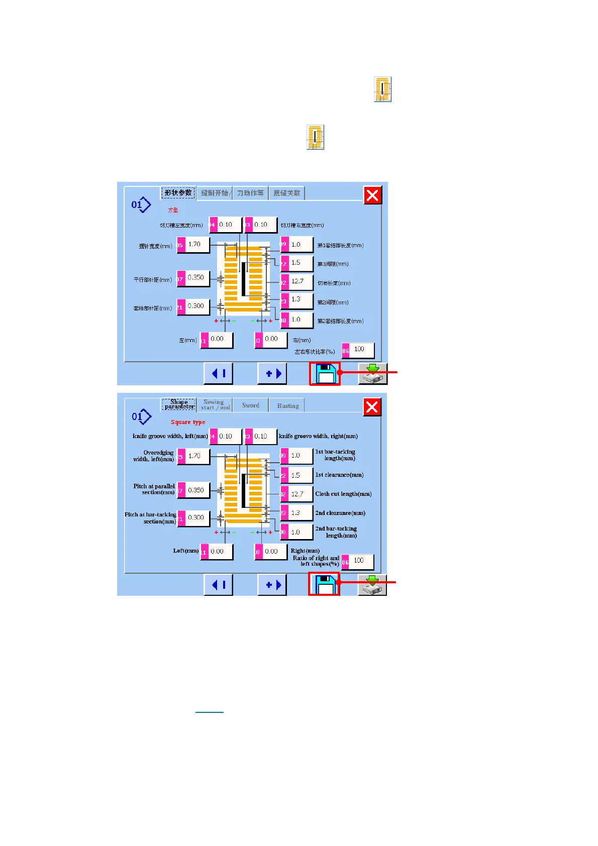And you can change parameter in <sewing start/end>、<sword>、<basting> screen. Press F button (See figure5.14.) to save