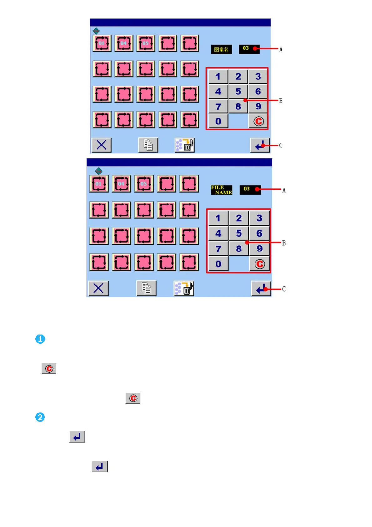 Press ENTER button C and finish inputting number. Then the inputted number is continuous stitching file’s name.