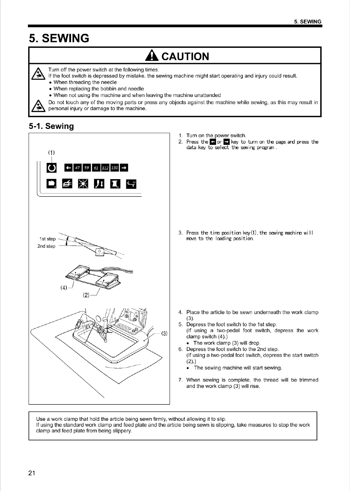 Use a work clamp that hold the article being sewn firmly, without allowing it to slip.