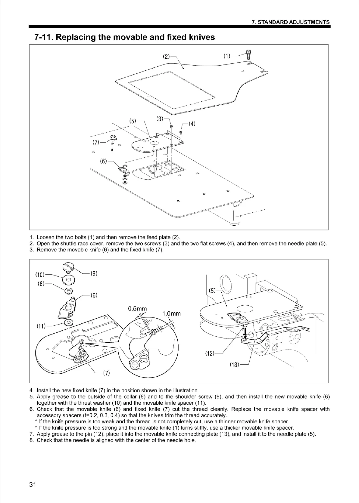 6. Check that the movable knife (6) and fixed knife (7) cut the thread cleanly. Replace the movable knife spacer with
