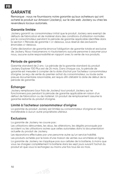 La garantie du produit Jackery est limitée au consommateur d'origine et n'est