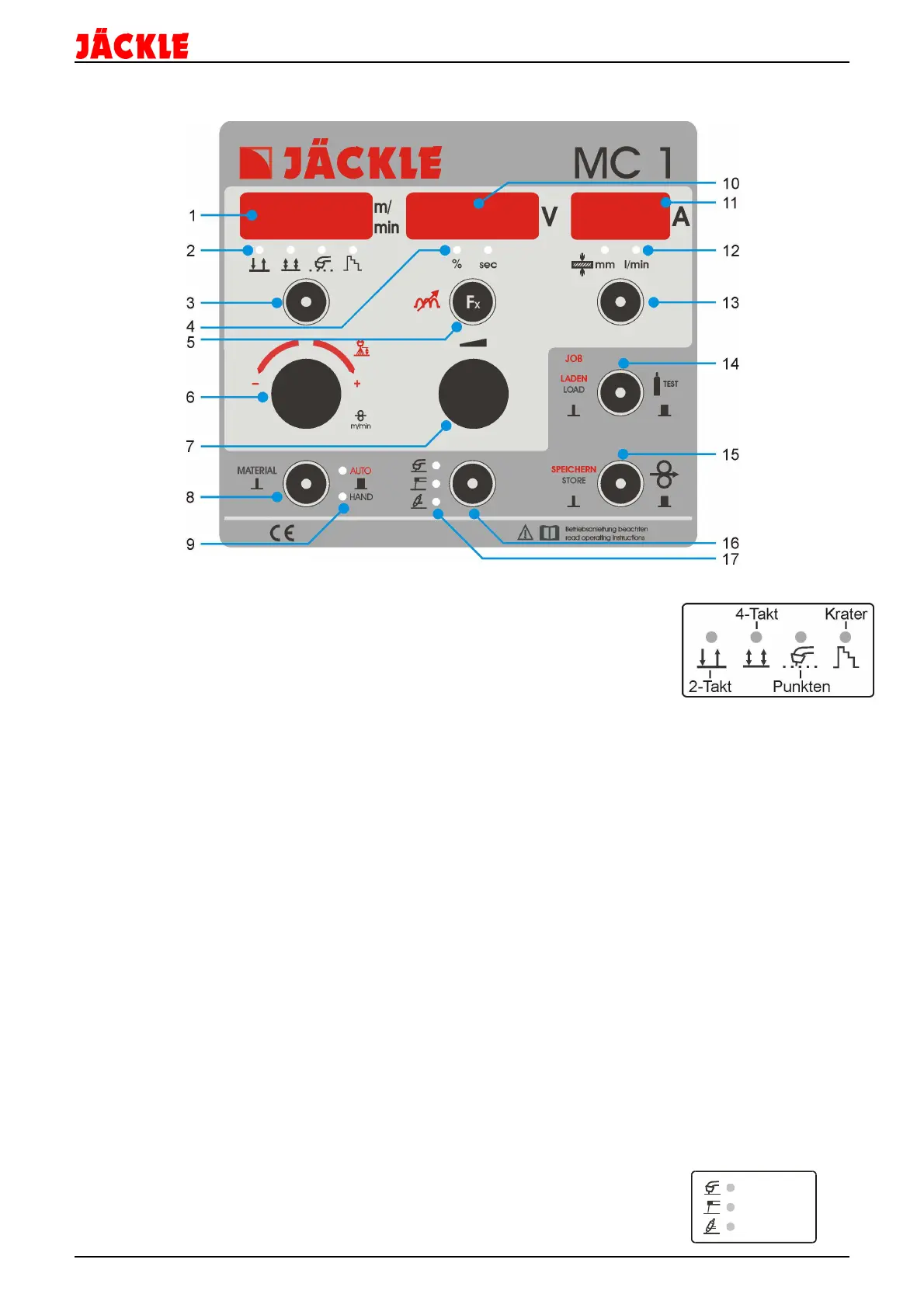13 – Bedientaste um zwischen Schweißstrom und Materialdicke (antippen kürzer als 0,5 Sekunden), bzw.