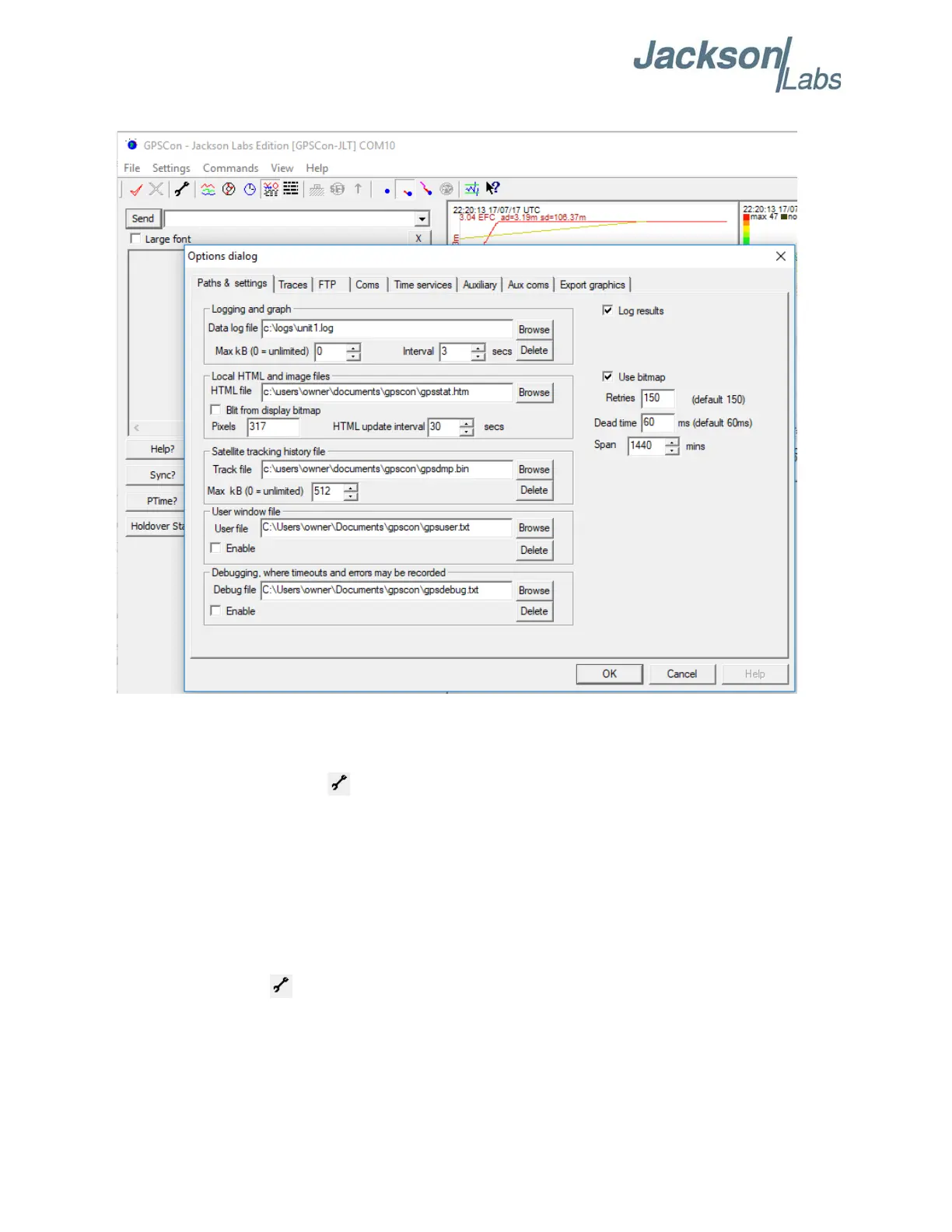 dialog box by pressing the wrench icon. Then select the “Coms” tab. You will see the window
