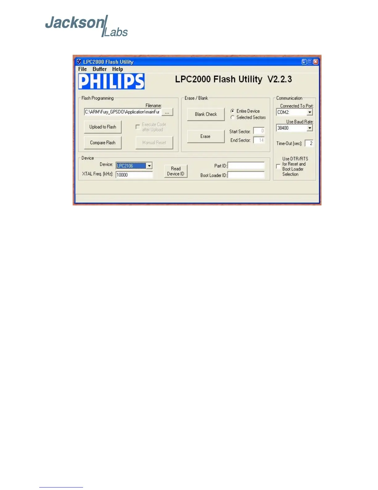 The “DEVICE” should show up as “LPC2138” after pressing “READ DEVICE ID”