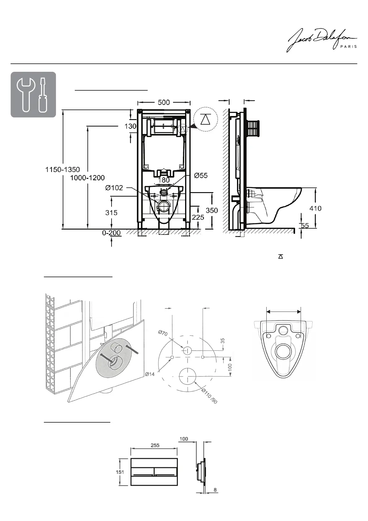 Jacob Delafon MARCEL PACK E21182-00 - Dimensions and Measurements; Casing Cut-out; Control Plate Details