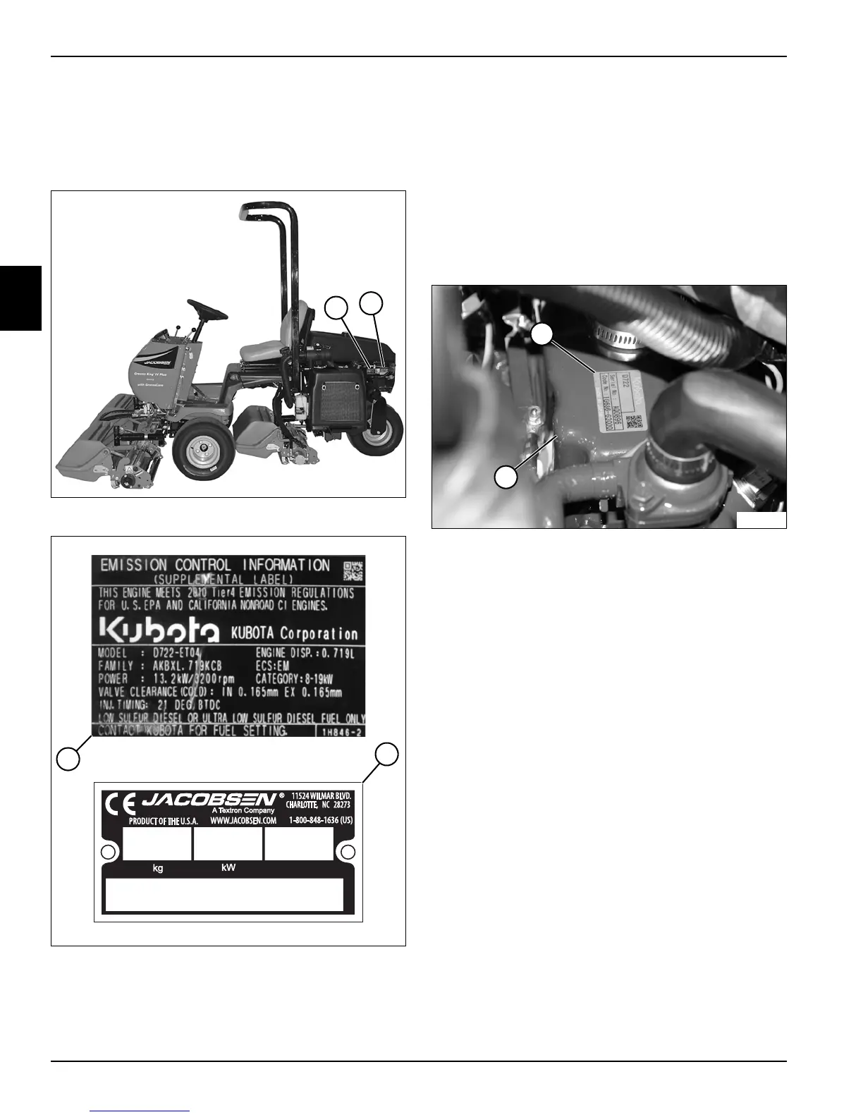 A machine emission control information label (1) lists the