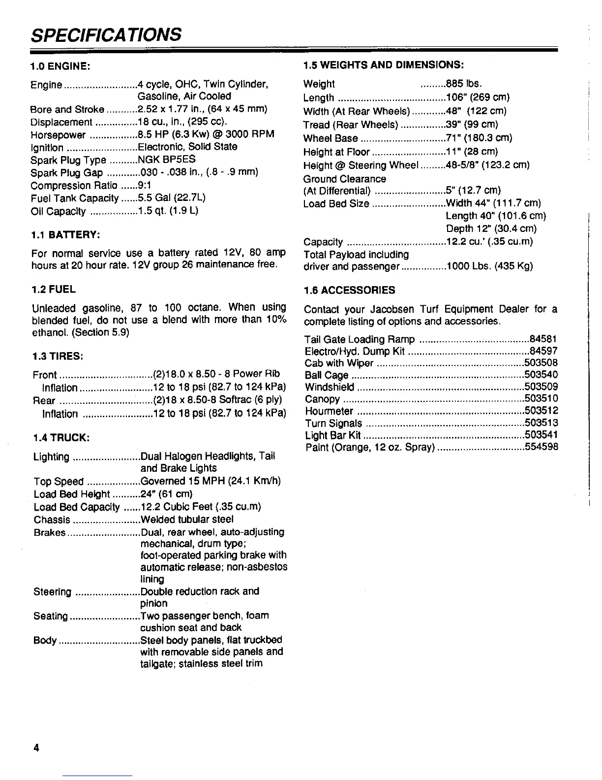 Jacobsen 810 - Specifications; Engine Specifications; Truck Specifications; Weights and Dimensions