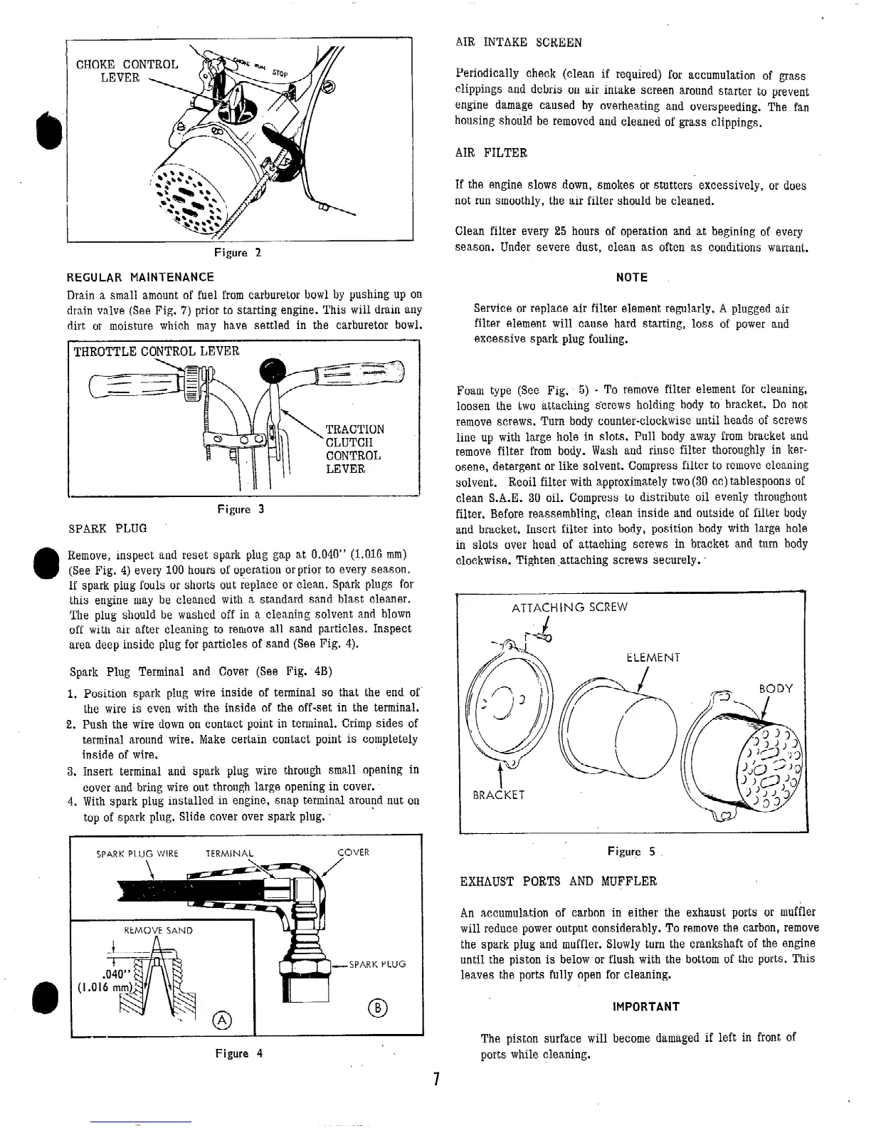 Jacobsen J-501 - Choke Control Lever; Regular Maintenance; Spark Plug; Exhaust Ports and Muffler