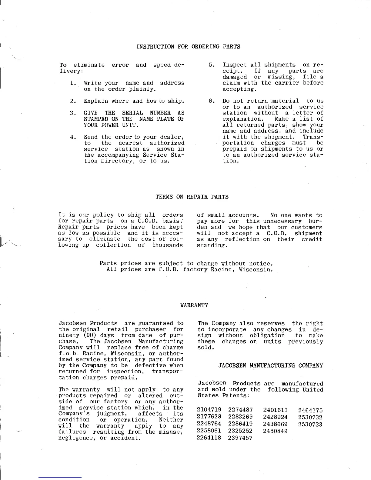 Jacobsen Lawn Queen 21'' - ORDERING PARTS AND WARRANTY INFORMATION; INSTRUCTION FOR ORDERING PARTS