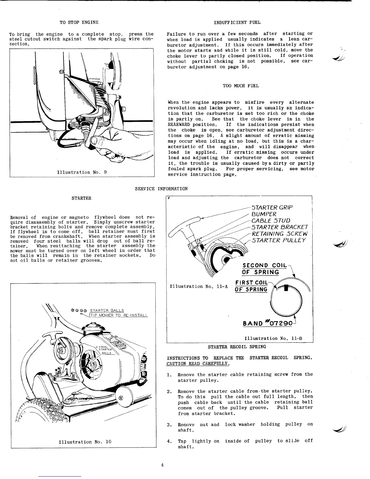 Jacobsen Lawn Queen 21'' - To Stop Engine; Insufficient Fuel; Starter; To Replace the Starter Recoil Spring