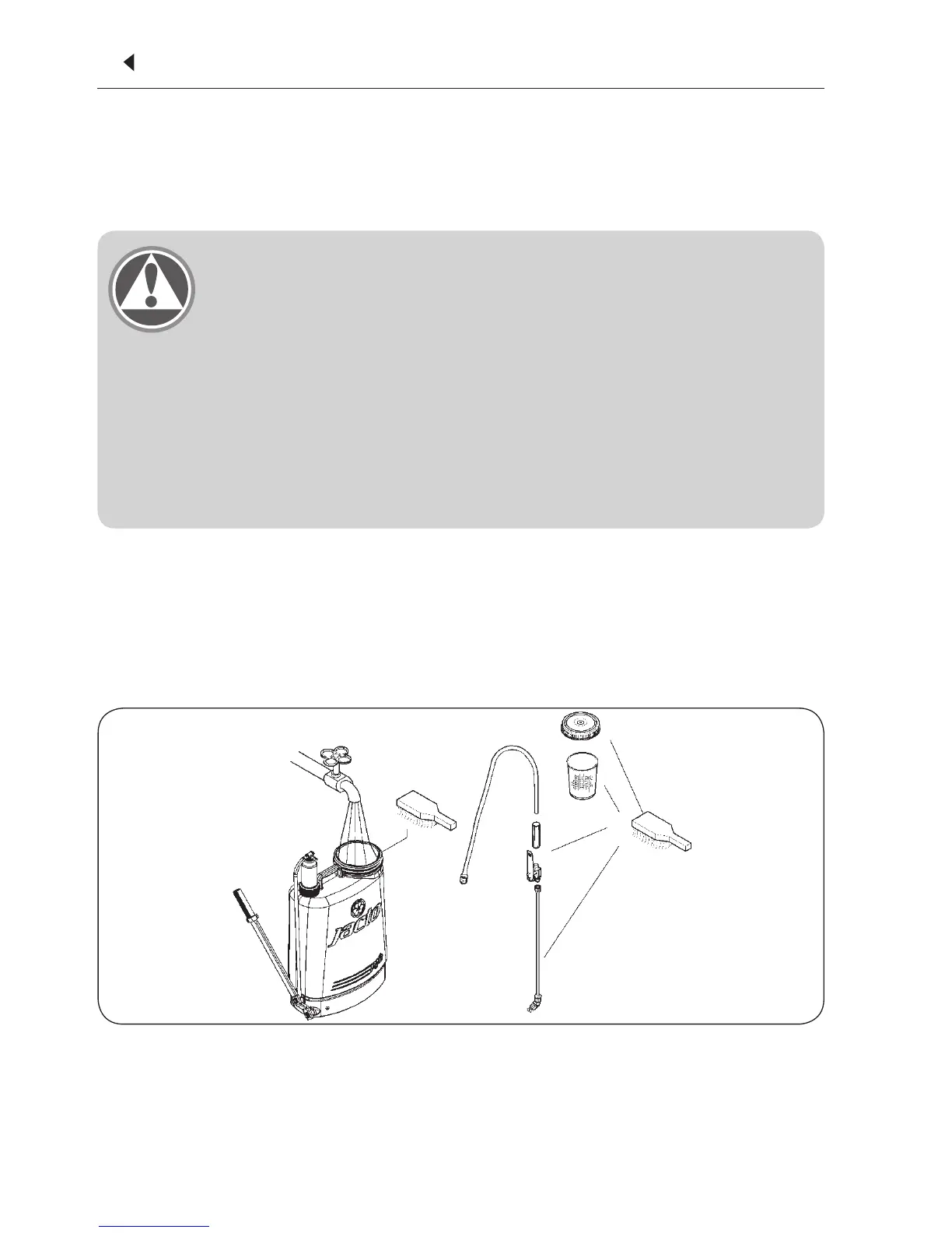∙ After assembling the sprayer, fill the tank with clean water and pressure-