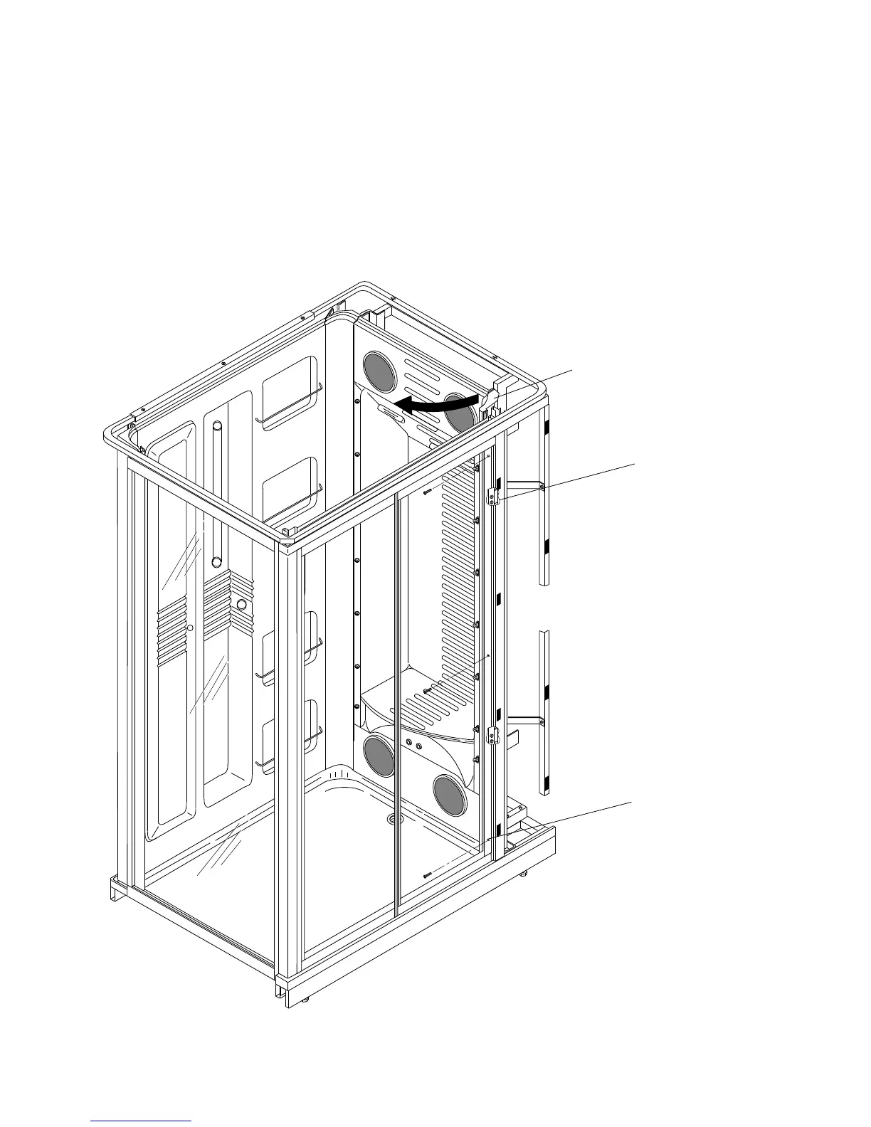 Remove 3 screws along the door frame post. Then remove 4 hex head bolts along the seat wall. Swing seat wall with