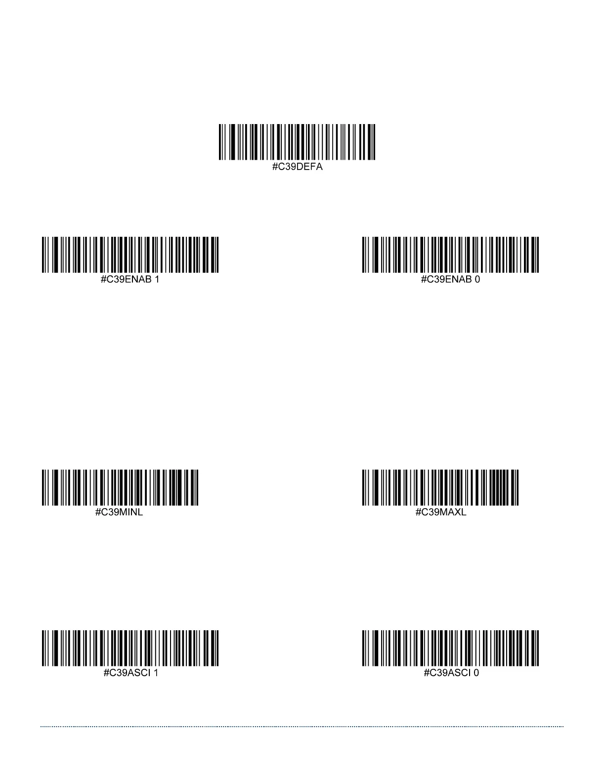 Scan one of the codes below to enable or disable Code 39. Default = Enabled.